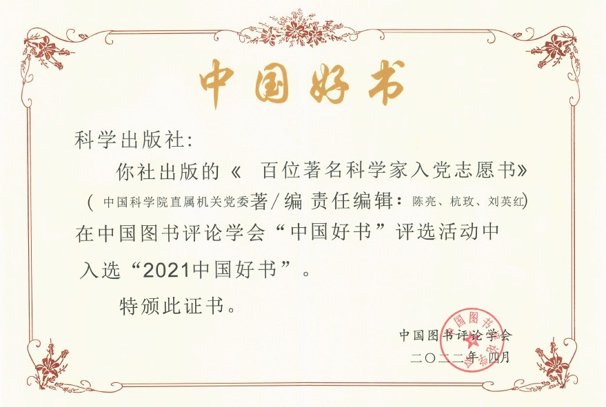 適逢第27個“世界讀書日”,由中宣部指導、中國圖書評論學會評選、中央廣播電視總臺承制的年度優秀圖書頒獎典禮于2022年4月23日晚隆重舉行,揭曉2021年度“中國好書”,科學出版社出版的《百位著名科學家入黨志愿書》入選2021年度“中國好書”。